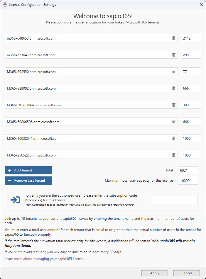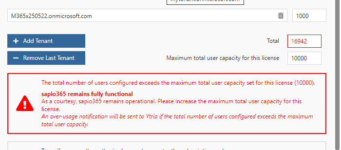 Click on ‘Add Tenant’ to add a row in the list for each tenant you want to manage with sapio365. You can adjust the number of users for each tenant as long as the total capacity is not exceeded.