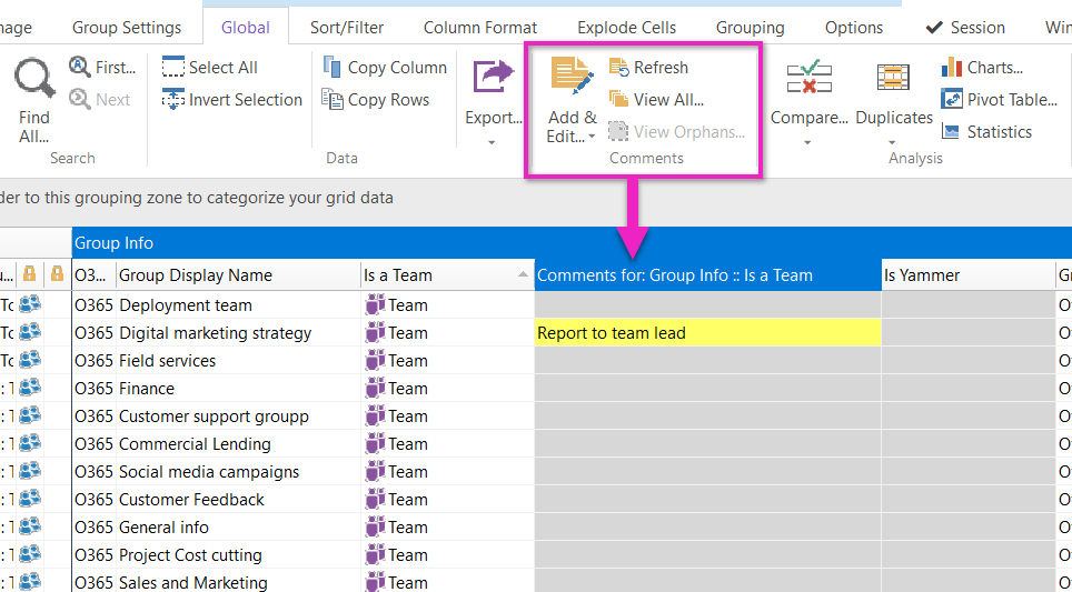 Add or edit your own comments to selected rows:
