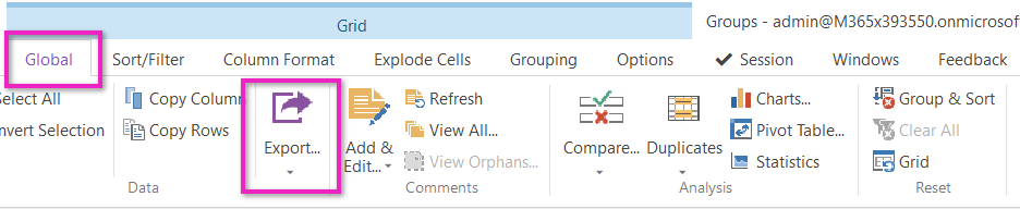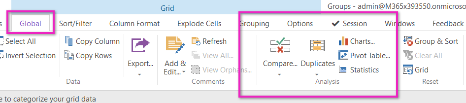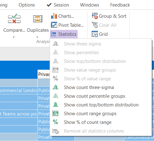 The Global tab provides a range of tools for more advanced analysis such a charting, pivot table finding duplicates, comparison and statistical operations.