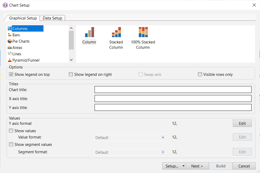 Choose among various chart types and display options including pie, bar, graph etc..