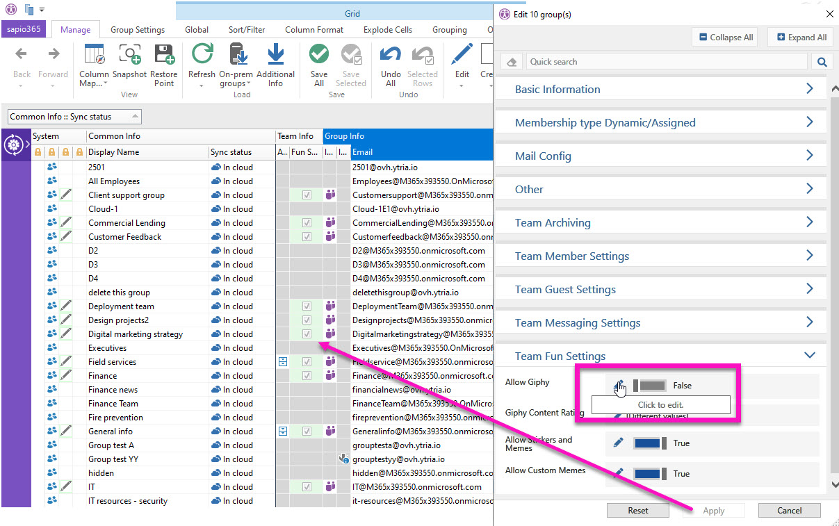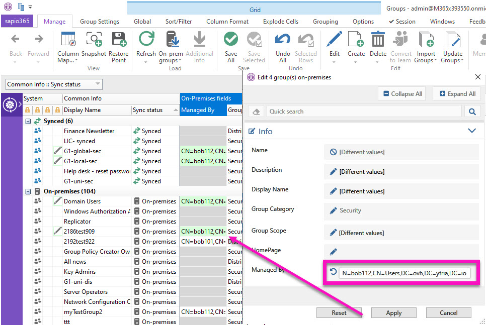 Mass-edit selected groups' properties all at once and preview your changes before committing them.