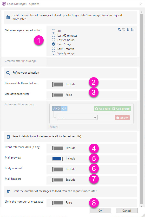 | 3 | Advanced filter | Load messages based on their properties. Ex. Attachments = True. |