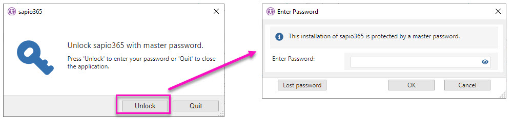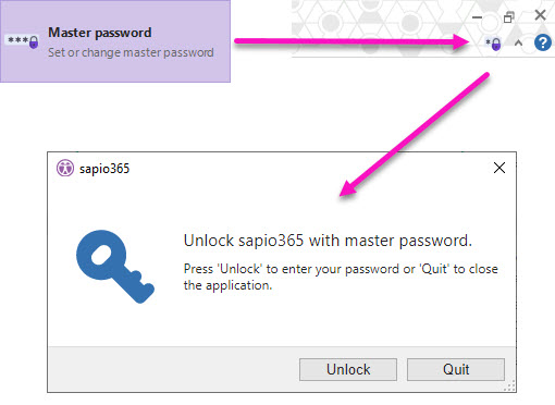 Click on the small lock icon to lock sapio365. A dialog will appear and can only be closed by unlocking with the master password or by quitting the application.