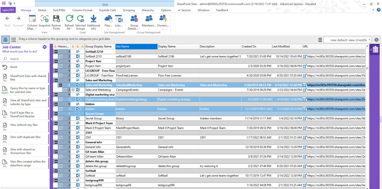 This feature only applies to Microsoft 365 type groups and Teams and launches a new view displaying the SharePoint Online sites and subsites for those selected groups.